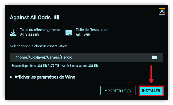 Une fenêtre s’affiche pour vous demander où et comment installer Against All Odds. Ne changer rien: laissez le jeu s’installer confortablement dans votre dossier Heroic habituel et laisser la version de WINE par défaut. Cliquez juste sur « Installer ».