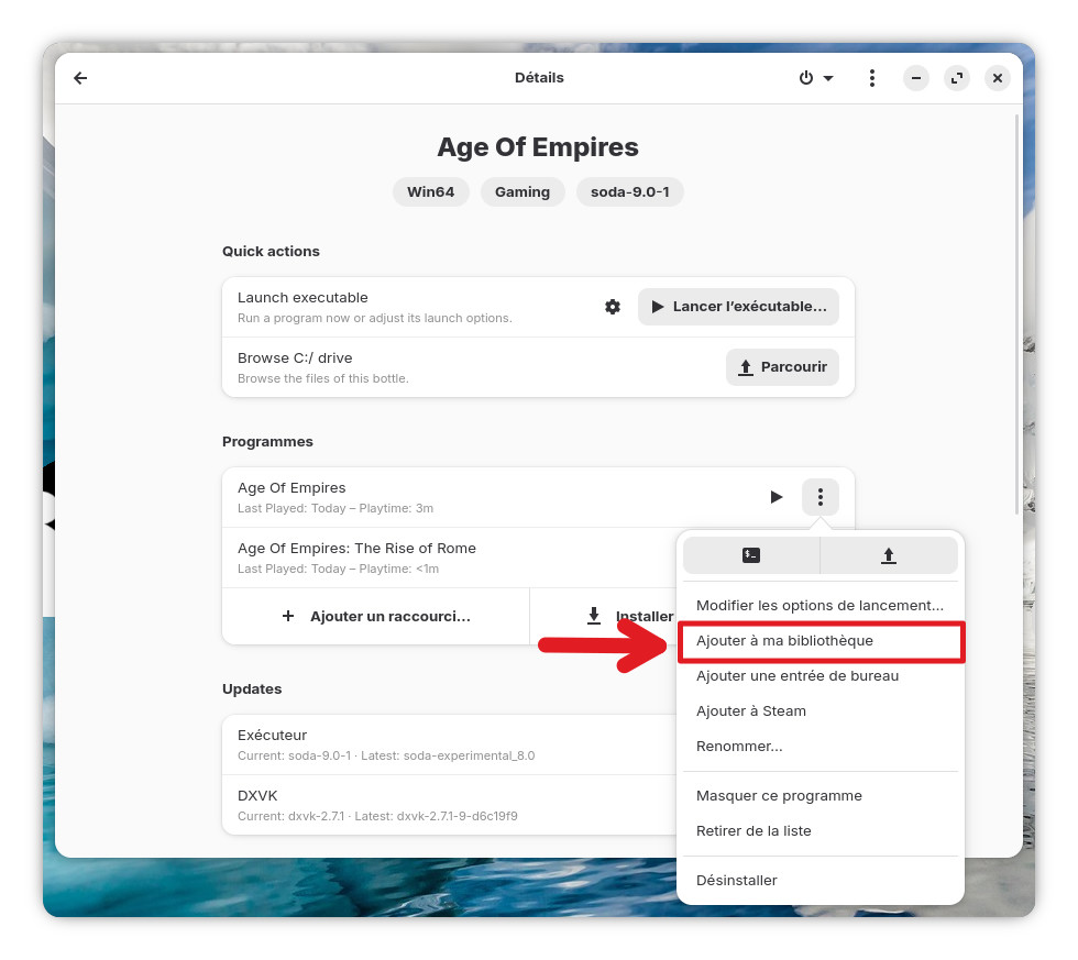 Sur la page de gestion de la bouteille, cliquer sur les 3 petits points du jeux concerné et cliquez sur « Ajouter a ma bibliothèque« .