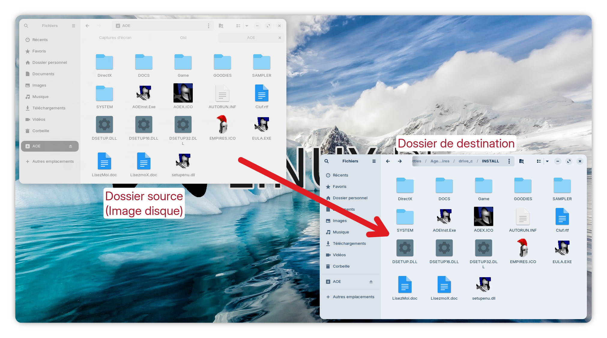 Sur votre espace de travail, il vous faudra ouvrir à la fois la fenêtre de l’image disque monté du jeu ainsi que la fenêtre du dossier « INSTALL » côte à côte comme sur la capture ci-dessous. Vous devrez ensuite copier l’intégralité du contenu de l’image disque vers le dossier « INSTALL« .