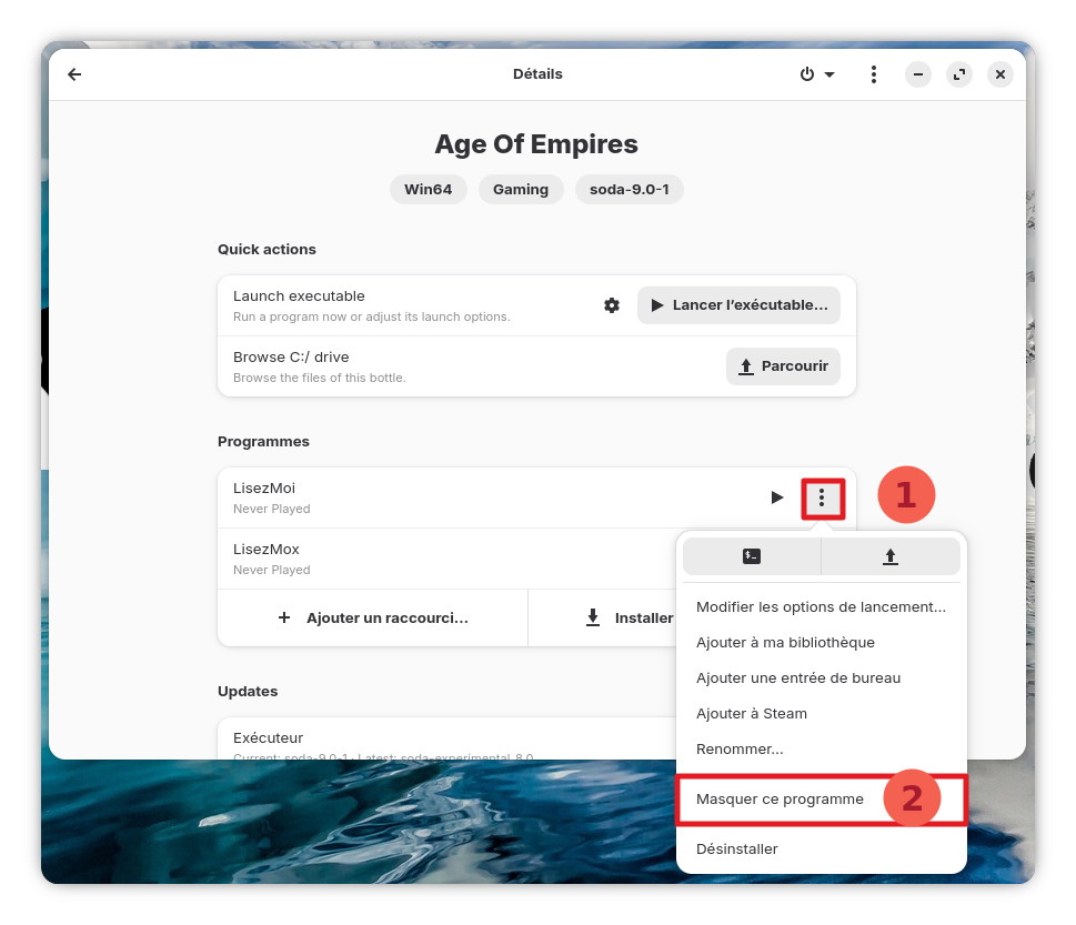 Lorsque le programme finira de s’installer, deux raccourcis s’afficheront sur la page de gestion de la bouteille. Ces raccourcis faisant référence aux fichiers Lisez-moi du jeu, il ne seront pas utiles: vous pouvez les supprimer en cliquant sur le 3 petits point à droite de l’entrée et cliquer sur « Masquer ce programme » pour les deux raccourcis.