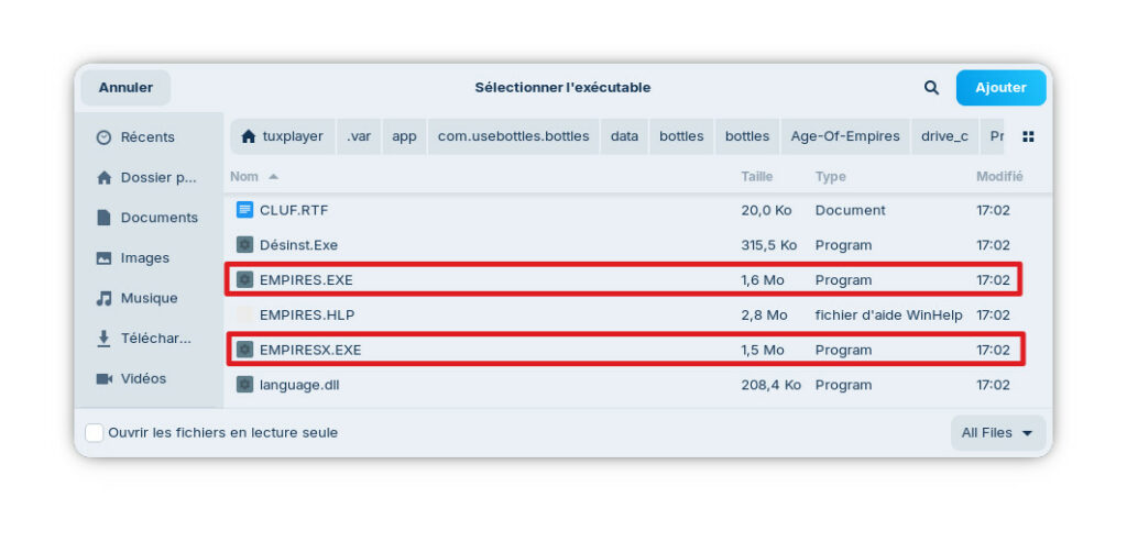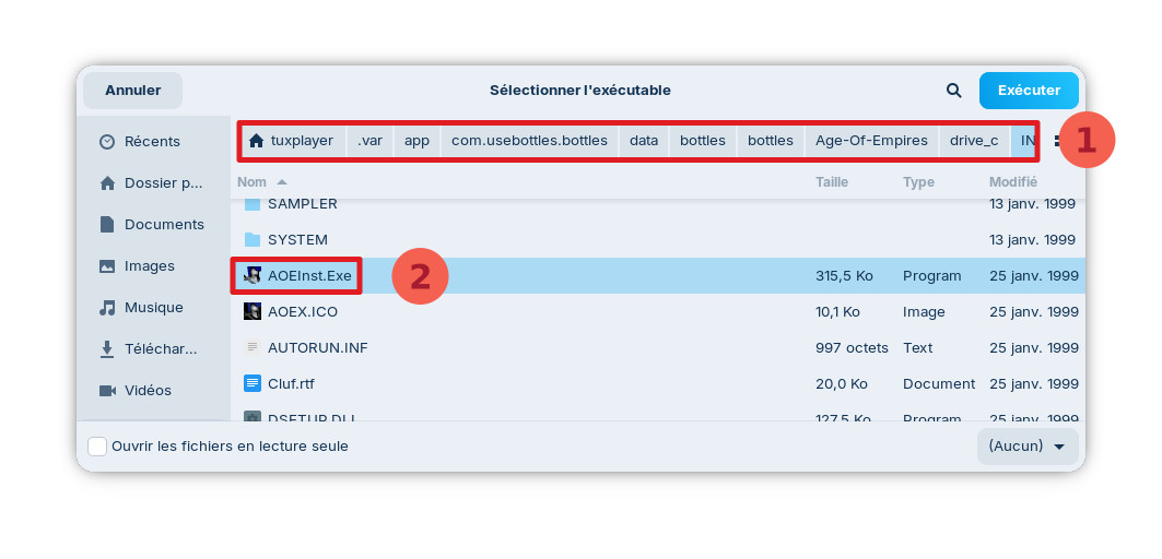 Une fenetre s’ouvre pour vous permettre de sélectionner le fichier à effectuer. Rendez-vous alors à l’adresse suivante: « /home/ »votrenomd’utilisateur »/.var/app/com.usebottles.bottles/data/bottles/bottles/Age-Of-Empires/drive_c/INSTALL » et selectionner le fichier « AOEInst.Exe« .