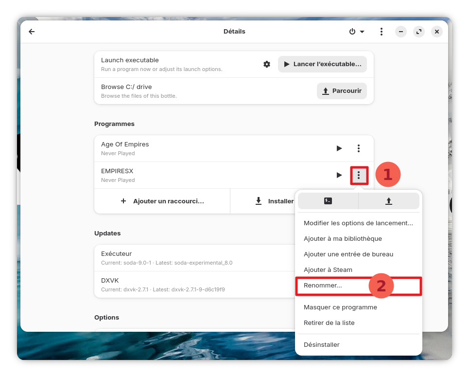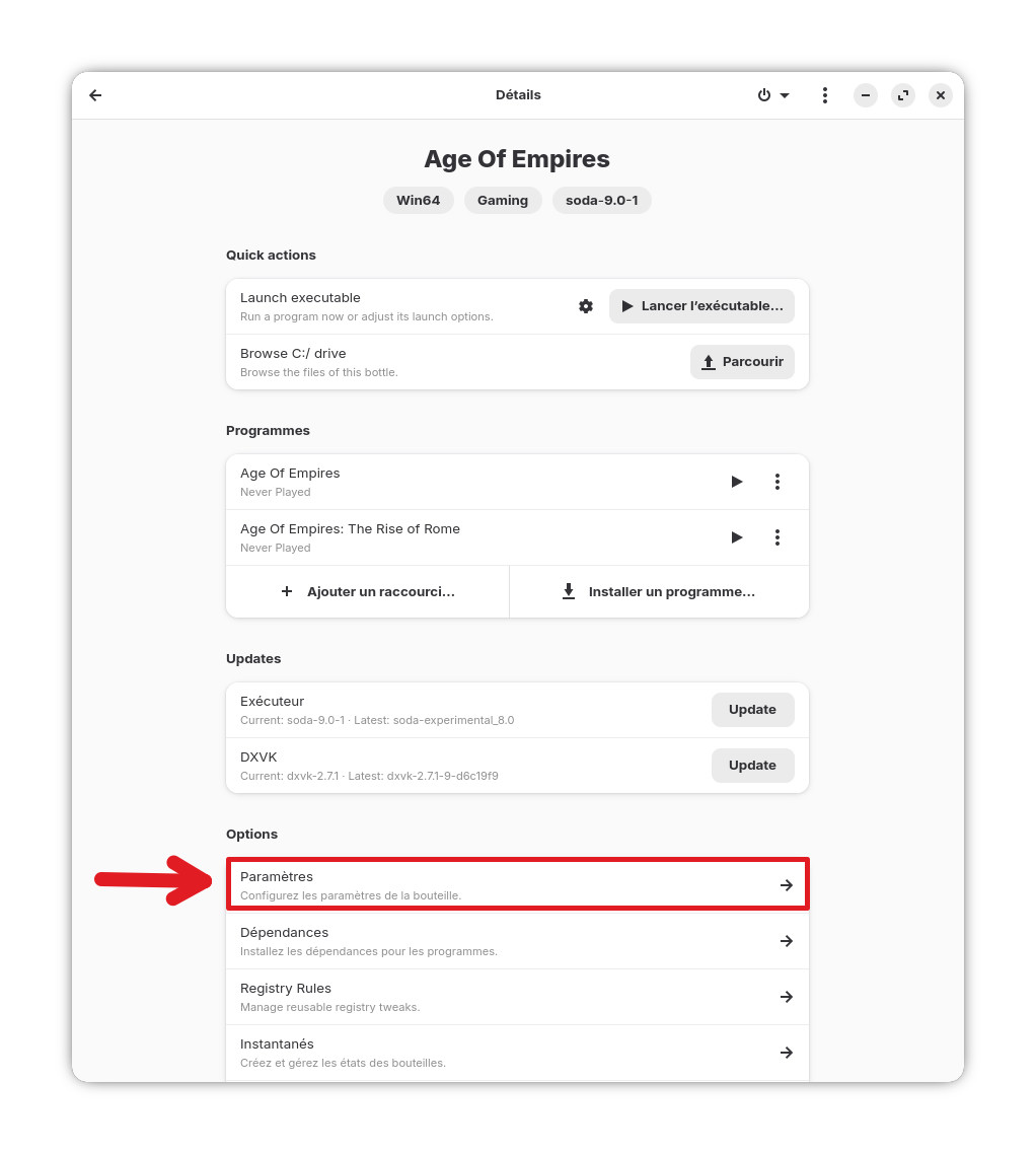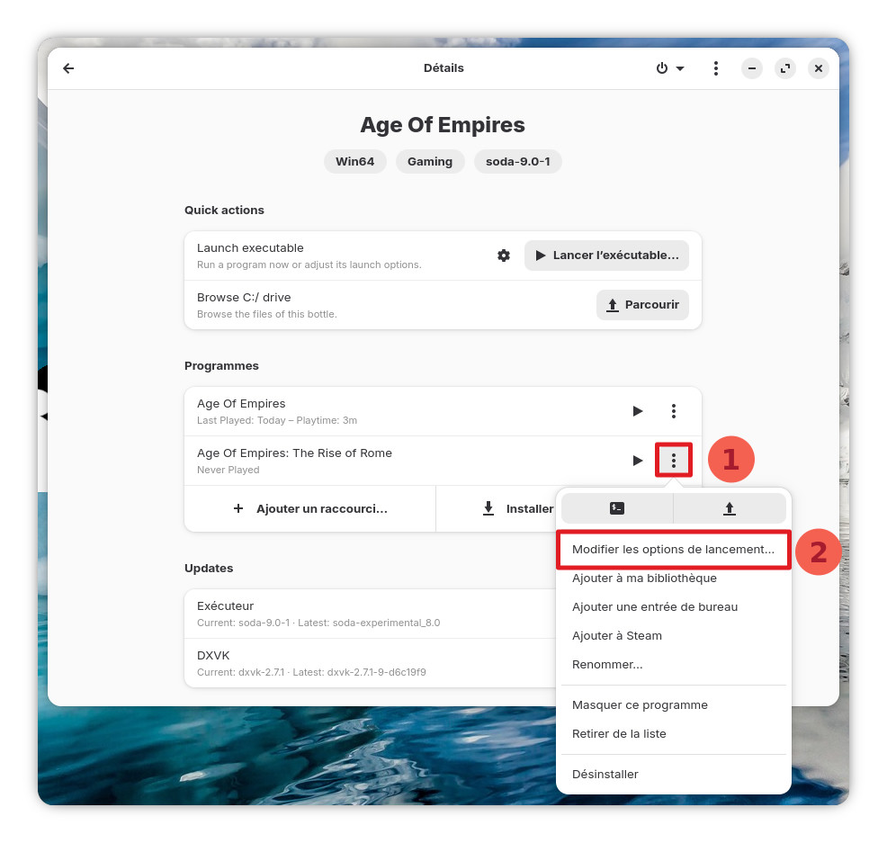 Retournez dans la page de gestion de la bouteille du jeu et cliquez sur les 3 petits points à droite de l’entrée « Age of Empires – The Rise of Rome« . Dans la liste, cliquez sur « Modifier les options de lancement« .