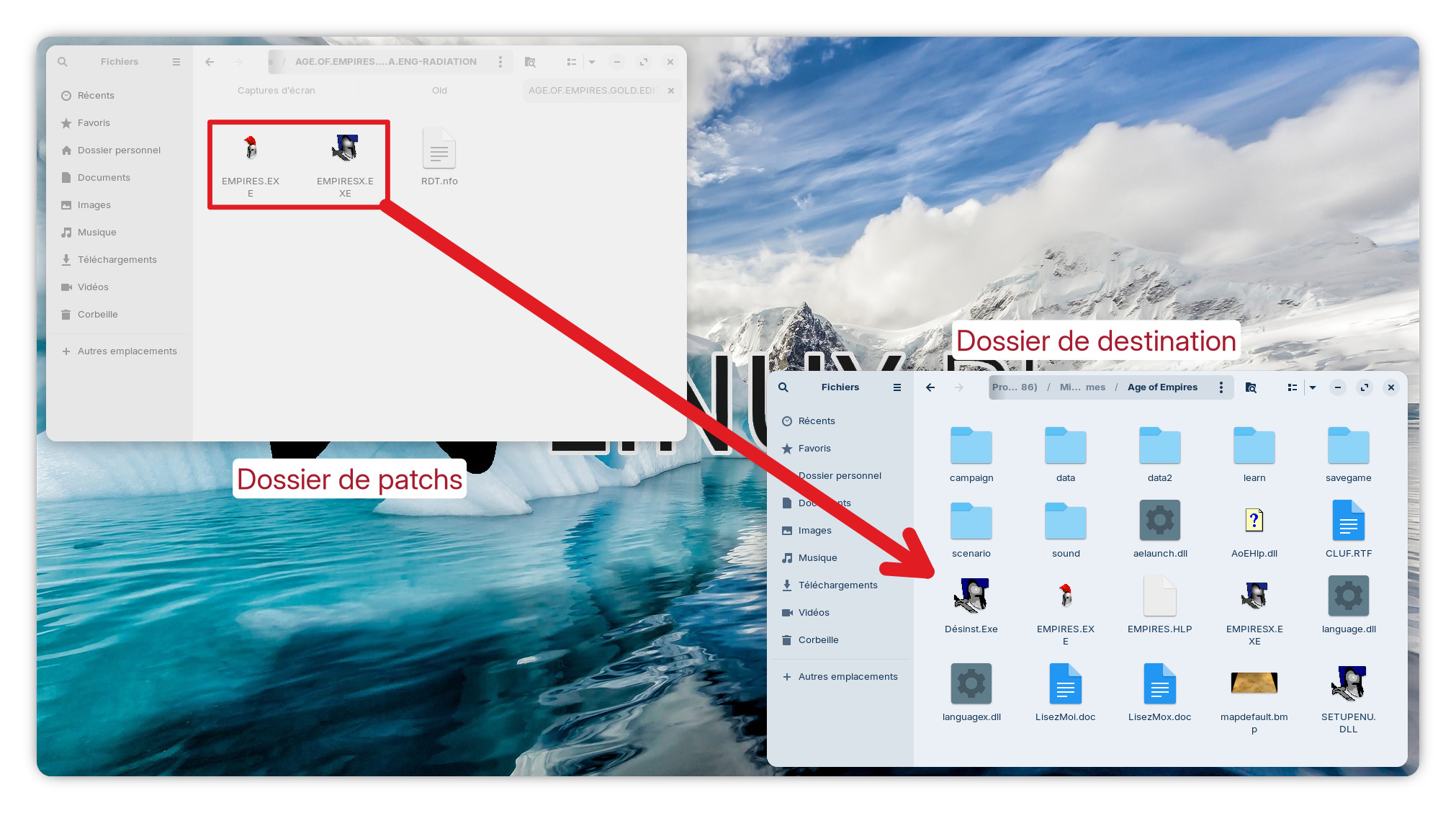Afficher sur votre espace de travail la fenêtre contenant les patchs ainsi que la fenêtre contenant les fichiers du jeu puis copier les fichiers « EMPIRES.EXE » et « EMPIRESX.EXE » provenant du dossier patch vers le dossier du jeu.