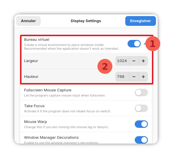 Puis activez le « Bureau virtuel » et renseignez la résolution suivante: « 1024 » dans la Largeur et « 768 » dans la Hauteur.