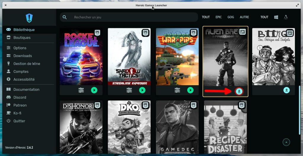 Pour commencer, démarrez l’Heroic Games Launcher. Si vous avez pu récupérer le jeu gratuitement durant la période de l’offre (Mercredi 15 & Jeudi 16 février 2023), tant mieux. Sinon, vous pouvez l’acheter pour pas grand chose sur GOG, soit en passant par votre navigateur, soit via Heroic.