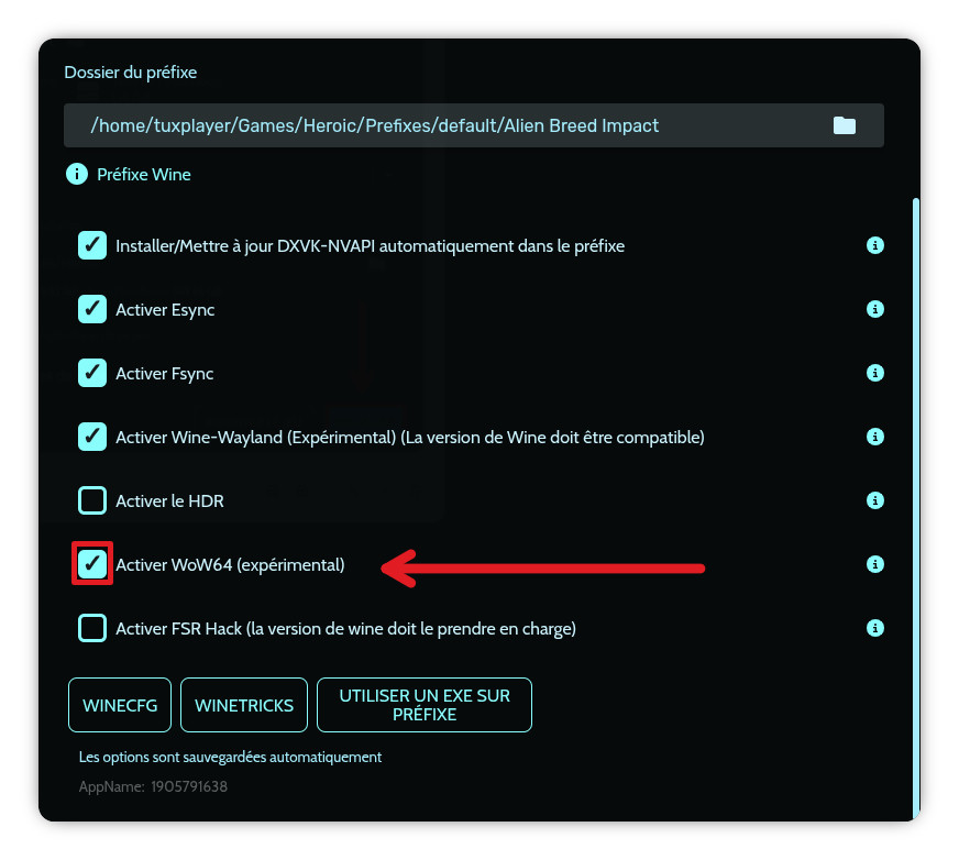 L’astuce sera d’activer une option pour qu’il s’exécute sous Wine en 64 bits.