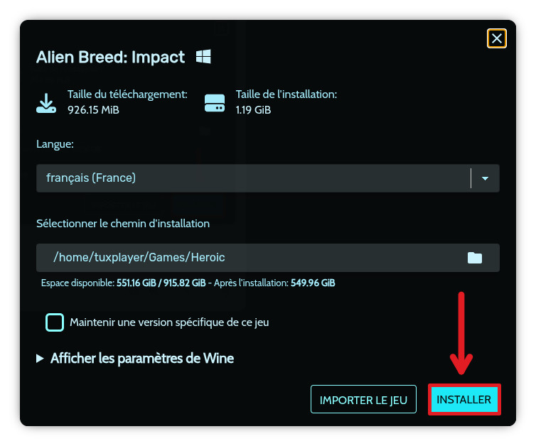 Une fenêtre s’affiche pour vous demander où et comment installer le jeu. Ne changer rien: laissez le jeu s’installer confortablement dans votre dossier Heroic habituel et laisser la version de WINE par défaut. Cliquez juste sur « Installer ».