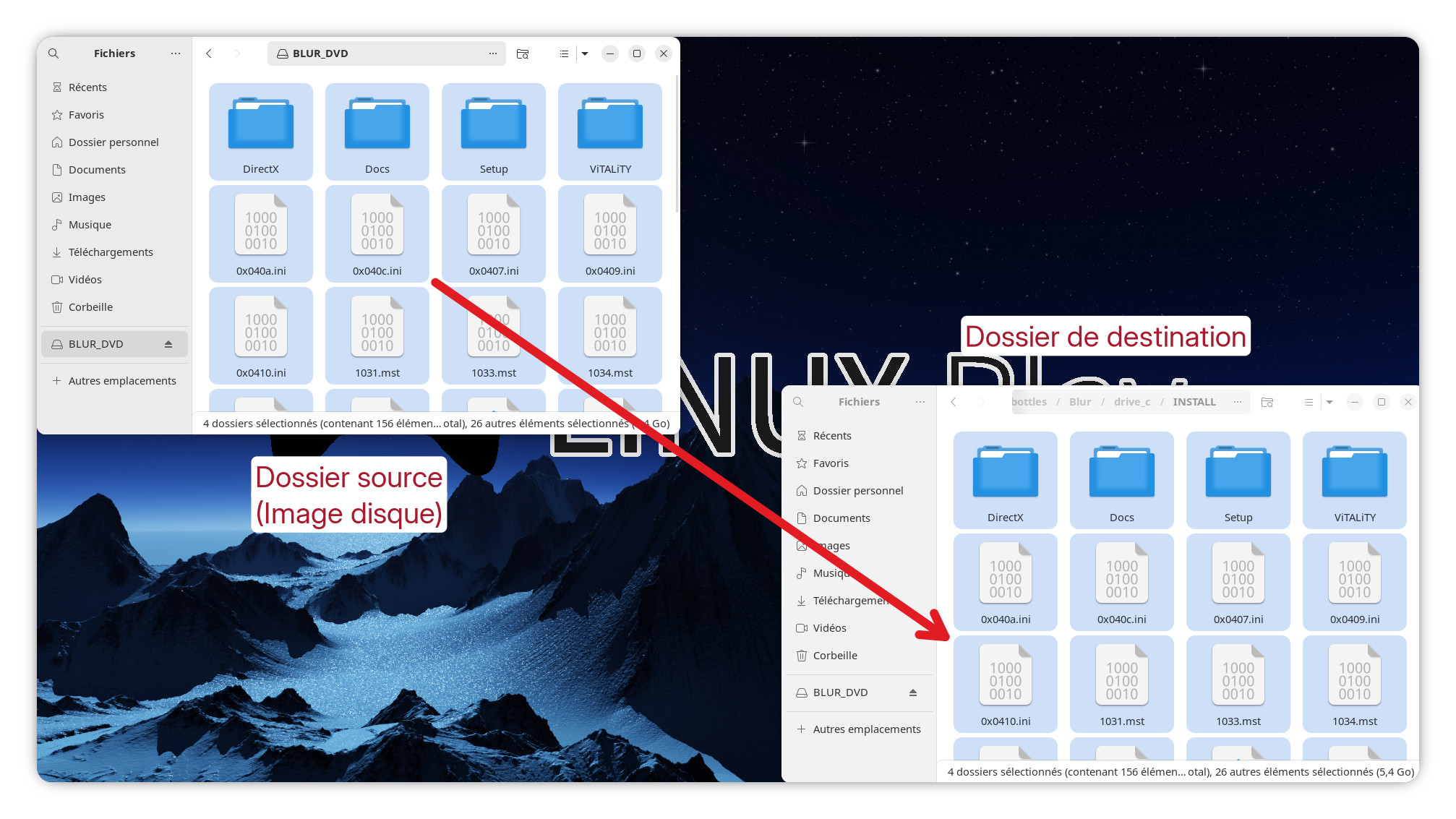 Sur votre espace de travail, il vous faudra ouvrir à la fois la fenêtre de l’image disque monté du jeu ainsi que la fenêtre du dossier « INSTALL » côte à côte comme sur la capture ci-dessous. Vous devrez ensuite copier l’intégralité du contenu de l’image disque vers le dossier « INSTALL« .