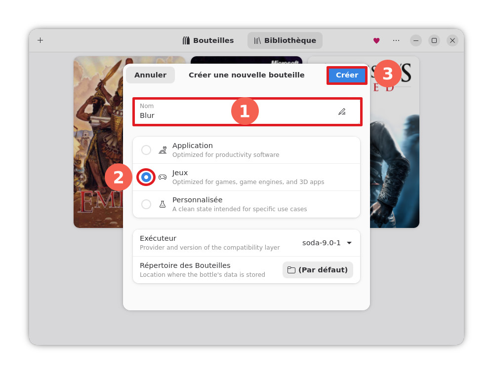 Indiquez le nom du jeux « Blur », sélectionnez ensuite le type de programme, ici un jeu, puis cliquez sur « Créer » pour procéder à la création de la bouteille. Cela peut prendre du temps en fonction des capacités de votre ordinateur.