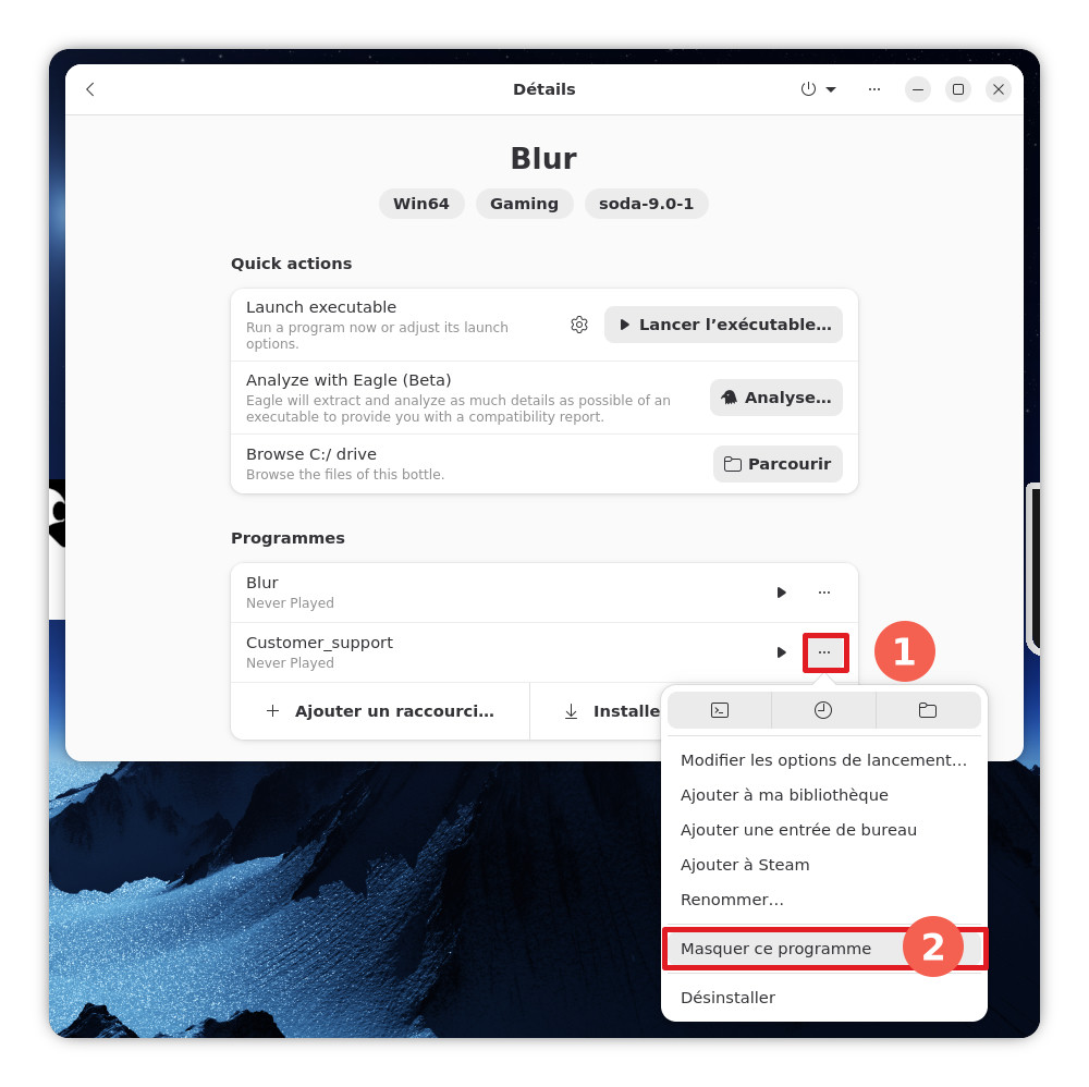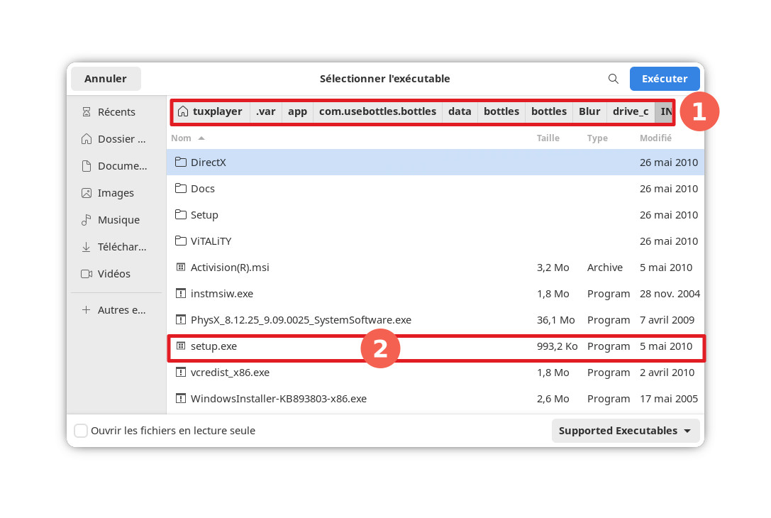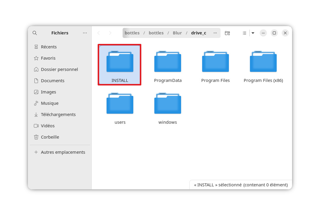 Une fenêtre s’ouvre pour vous permettre de sélectionner le fichier à effectuer. Rendez-vous alors à l’adresse suivante: « /home/ »votrenomd’utilisateur »/.var/app/com.usebottles.bottles/data/bottles/bottles/Blur/drive_c/INSTALL » et sélectionner le fichier « setup.exe« .