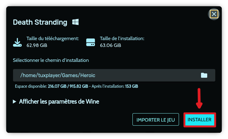 Une fenêtre s’affiche pour vous demander où et comment installer le jeu. Ne changer rien: laissez le jeu s’installer confortablement dans votre dossier Heroic habituel et laisser la version de WINE par défaut. Cliquez juste sur « Installer ».