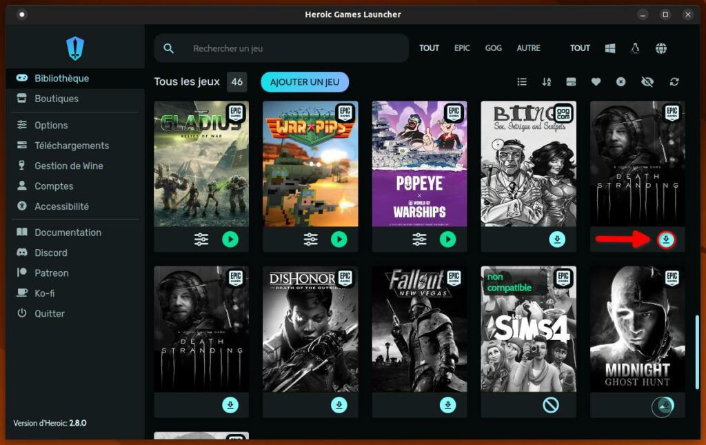 Pour commencer, démarrez l’Heroic Games Launcher. Pensez à récupérer Death Stranding tant qu’il est disponible et offert surtout via votre navigateur habituel ou en passant par Heroic.