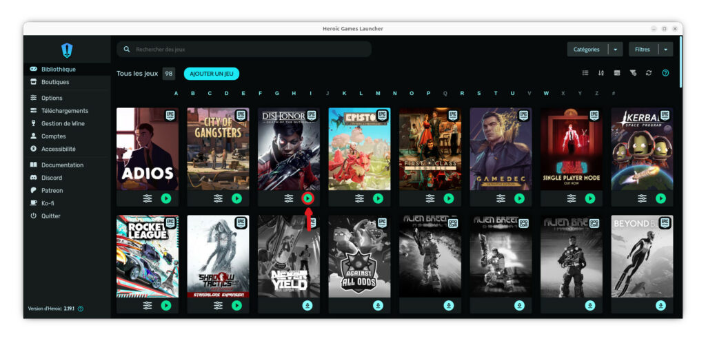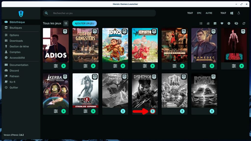 Une fois ceci fait, rendez-vous dans Heroic Games Launcher (si vous n’y êtes pas déjà). Vous arriverez directement dans votre bibliothèque avec les jeux en votre possession sur votre compte.