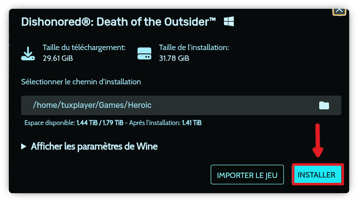 Une fenêtre s’affiche pour vous demander où et comment installer le jeu. Ne changer rien: laissez le jeu s’installer confortablement dans votre dossier Heroic habituel et laisser la version de WINE par défaut. Cliquez juste sur « Installer ».