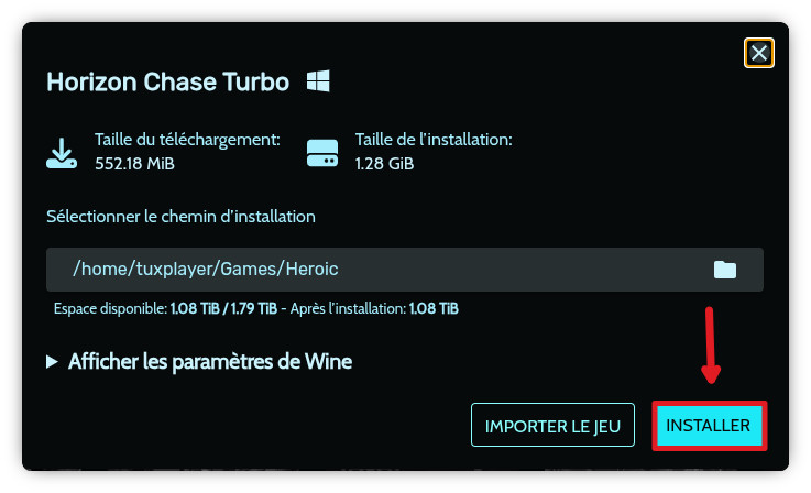 Une fenêtre s’affiche pour vous demander où et comment installer le jeu. Ne changer rien: laissez le jeu s’installer confortablement dans votre dossier Heroic habituel et laisser la version de WINE par défaut. Cliquez juste sur « Installer ».