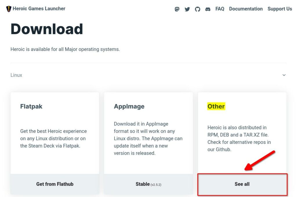 Sur la page de téléchargement, trois solutions vous sont proposé: le Flatpak, l’AppImage et Other (qui regroupe tout les autres types d’installation plus classique). Et vous savez quoi ? C’est ce dernier que nous allons choisir. Cliquez donc sur « See all » en bas de la rubrique « Other ».