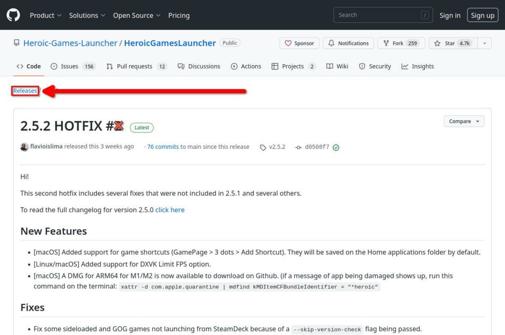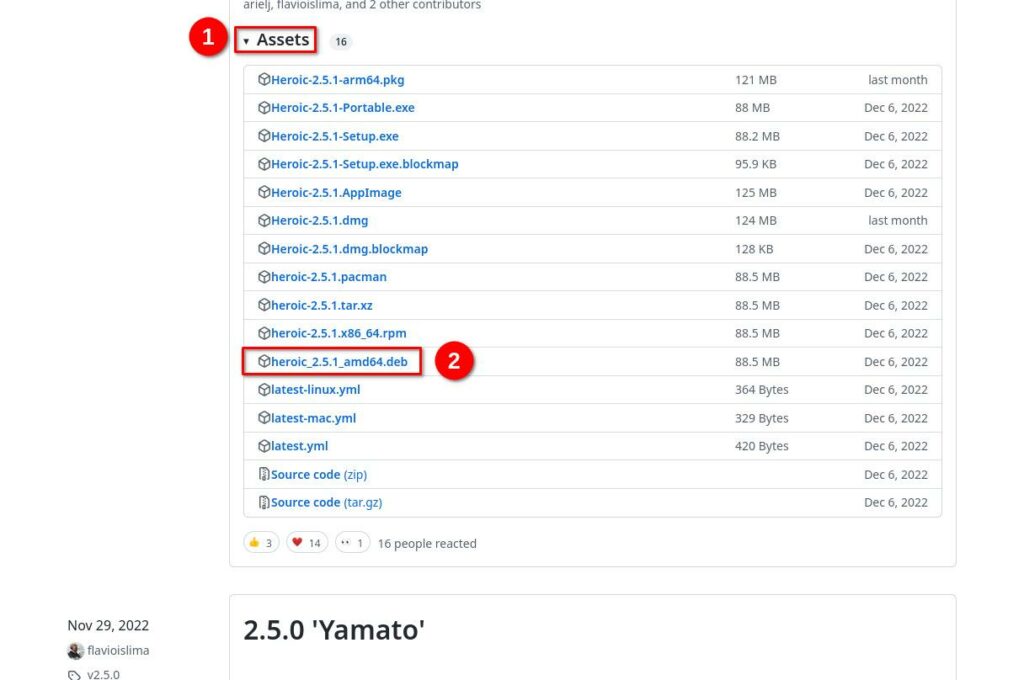 Ensuite descendez jusqu’au post « 2.5.1 HOTFIX #1 + macOS improvements » et en bas du post, cliquez sur « Assets » et choisissez « heroic_2.5.1_amd64.deb ». Ce fichier est destiné au système GNU/Linux Debian (et dérivé dont Ubuntu) en 64 bits.