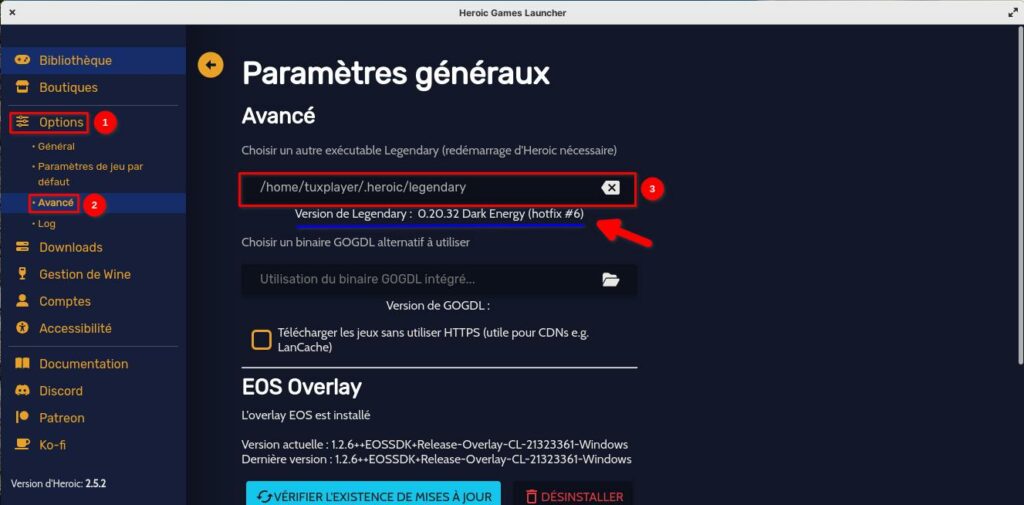 Retournez dans Heroic et dans le menu à gauche rendez-vous dans « Options » puis dans « Avancé ». Cliquez sur le champ en dessous de « Choisir un autre exécutable (redémarrage d’Heroic nécessaire) » puis indiquez le fichier « legendary » que vous avez téléchargé et placé dans le dossier « Games » de votre dossier personnel. La version de legendary devrait se modifier pour afficher la dernière version. Pensez à redémarrer Heroic à la suite de cette modification.