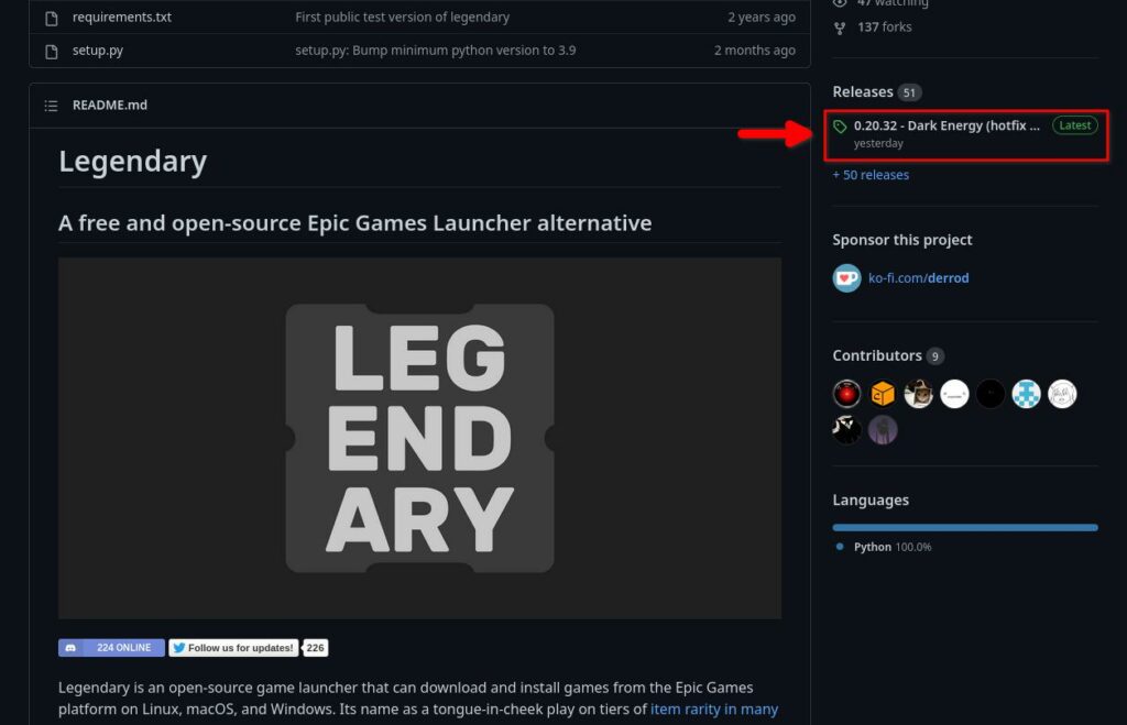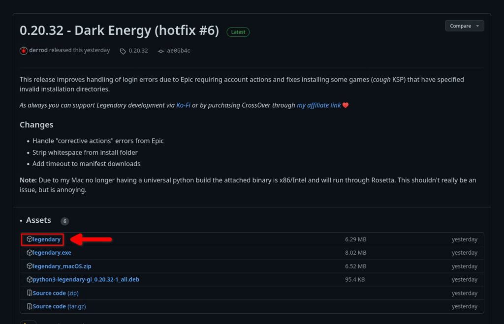 Rendez-vous sur la page GitHub du programme: https://github.com/derrod/legendary. Une fois dessus, cliquez sur le lien dans le menu à droite sous « Release ». Il s’agit de la dernière version de Legendary.