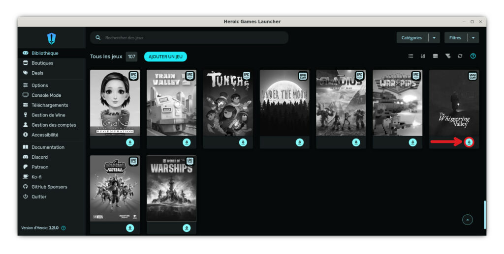 Pour commencer, démarrez l’Heroic Games Launcher. Pensez à récupérer Doomblade tant qu’il est disponible et offert surtout via votre navigateur habituel ou en passant par Heroic.