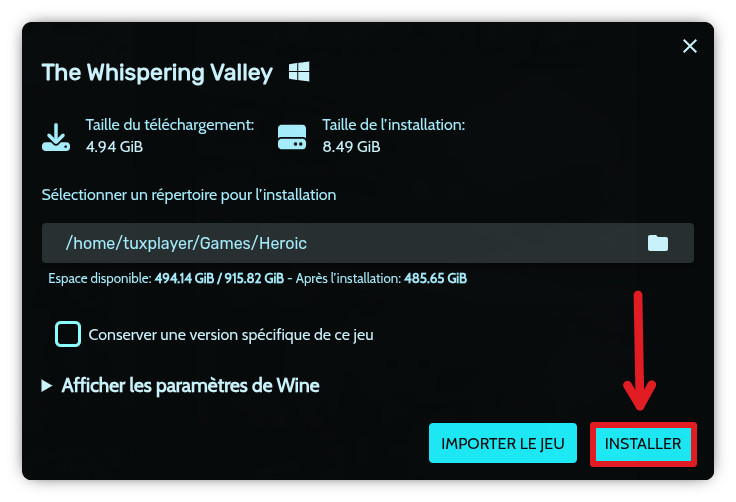 Une fenêtre s’affiche pour vous demander où et comment installer La Vallée qui Murmure. Ne changer rien: laissez le jeu s’installer confortablement dans votre dossier Heroic habituel et laisser la version de WINE par défaut. Cliquez juste sur « Installer ».