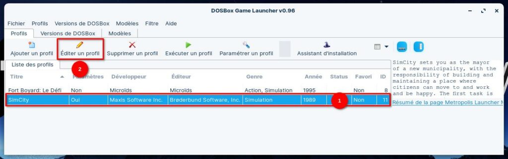 Le jeu est donc installé, mais pour plus de confort nous allons modifier l’affichage pour l’agrandir un peu. Pour cela, sélectionnez le jeu dans la liste et cliquez sur le bouton « Éditer un profil«