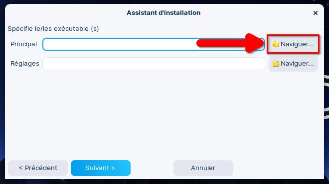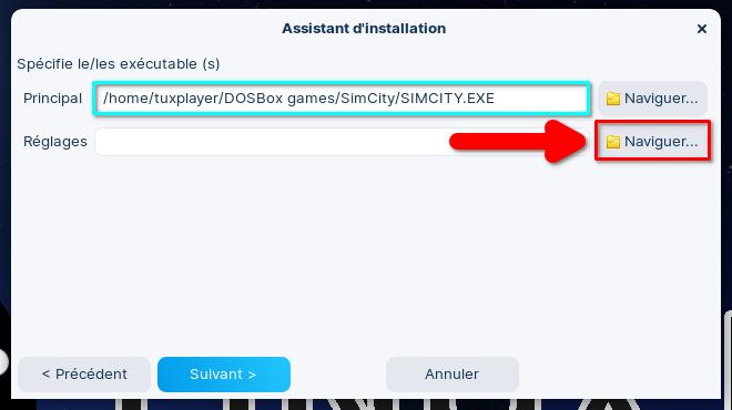 Le fichier exécutable indiqué, nous allons faire la même chose pour le fichier de réglages. Cliquez sur le deuxième bouton « Naviguer… » en face de la ligne « Réglages« .