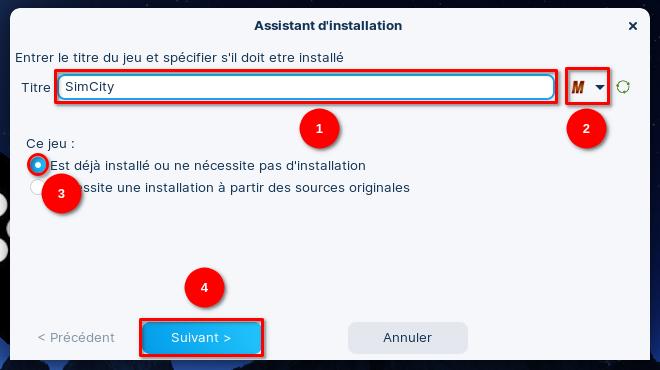 Une fenêtre s »affiche alors. Entrez le nom du jeu dans le champs de texte, choisissez la source de la base de donnée « Metropolis Launcher MobiGames Database » et indiquez que ce jeu « est déjà installé ou ne nécessite pas d’installation« . Cliquez ensuite sur « Suivant« .