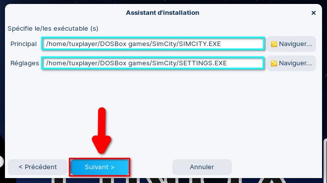 DBGL vous demandera ensuite d’indiquer le fichier exécutable du jeu ainsi que son son fichier pour effectuer les réglages pour celui-ci. Cliquez sur le premier bouton « Naviguer… » au bout de la ligne « Principal«