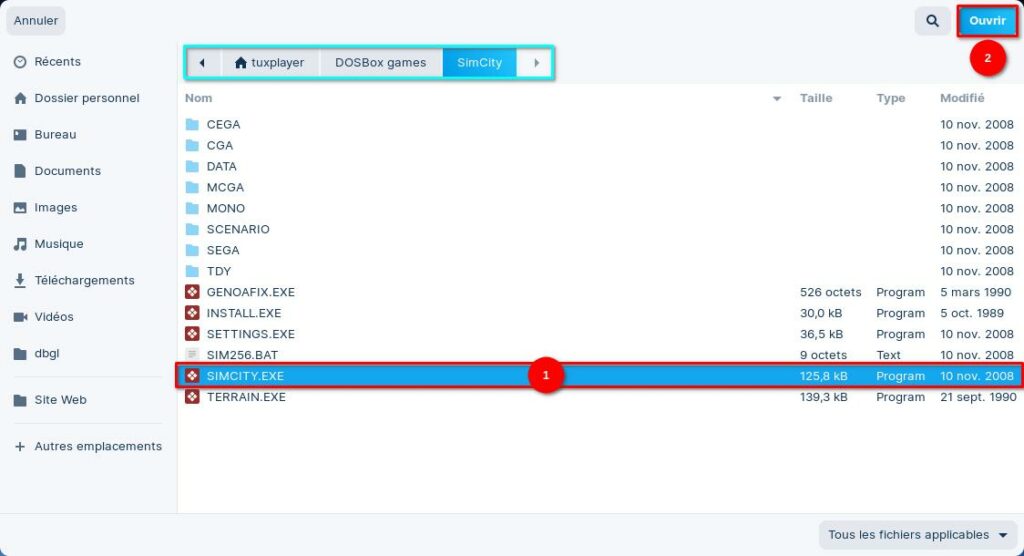 L’explorateur de fichier s’ouvre alors. Rendez-vous dans le répertoire où vous avez extrait votre jeu SimCity, dans le fameux dossier « DOSBox games » située dans votre répertoire personnel. De là, sélectionnez le fichier « SIMCITY.EXE » et cliquez sur le bouton « Ouvrir« .
