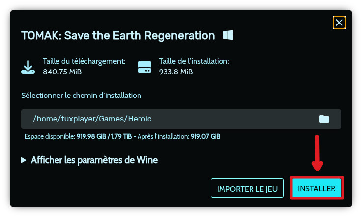 Une fenêtre s’affiche pour vous demander où et comment installer TOMAK: Save the Earth Regeneration. Ne changer rien: laissez le jeu s’installer confortablement dans votre dossier Heroic habituel et laisser la version de WINE par défaut. Cliquez juste sur « Installer ».