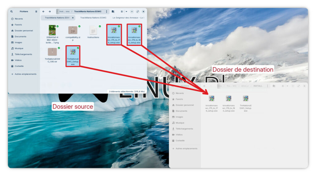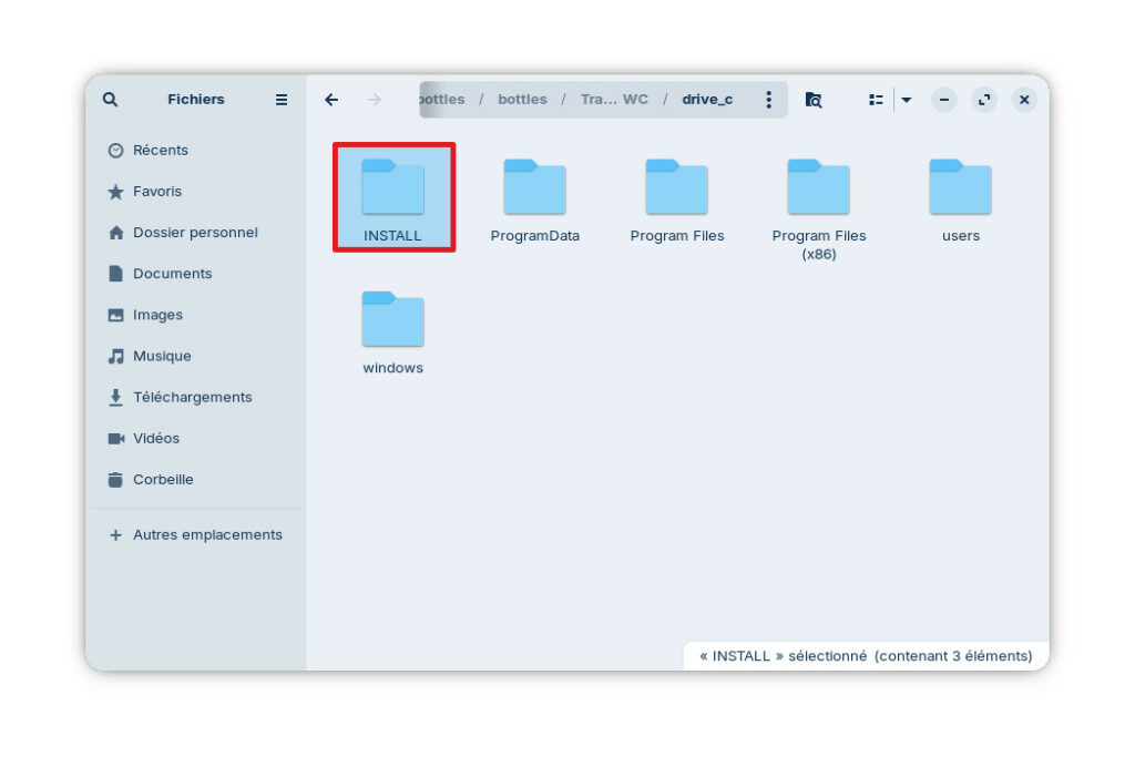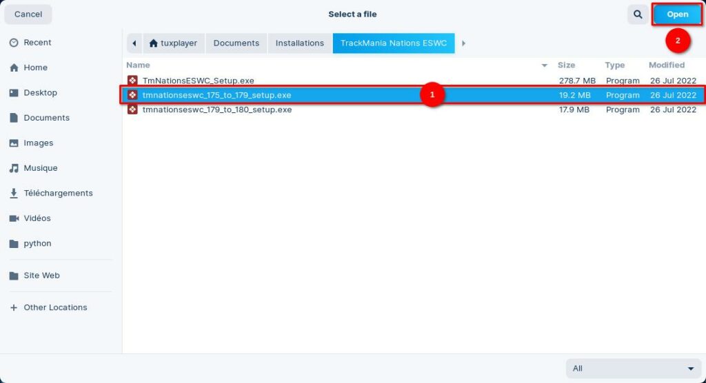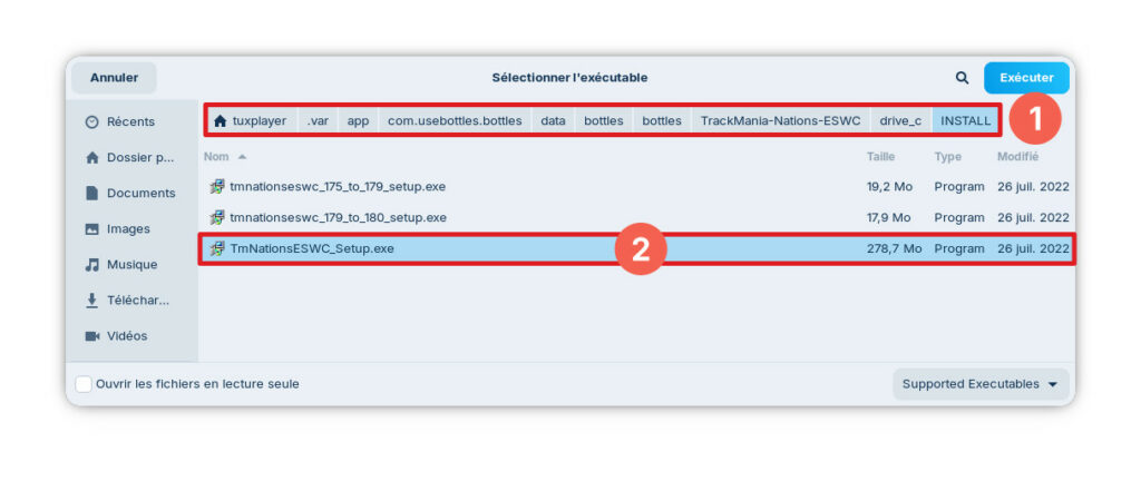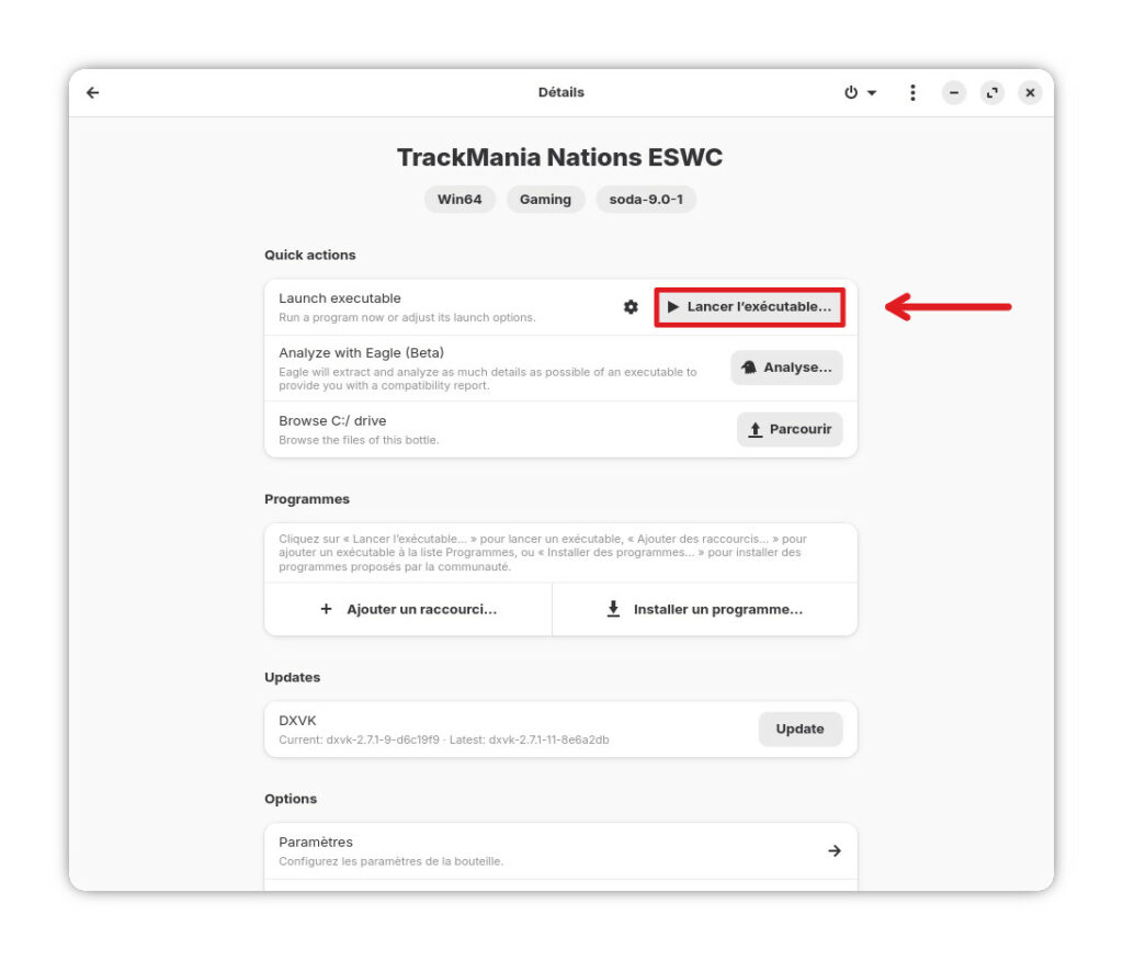 Une fenêtre s’ouvre pour vous permettre de sélectionner le fichier à effectuer. Rendez-vous alors à l’adresse suivante: « /home/ »votrenomd’utilisateur »/.var/app/com.usebottles.bottles/bottles/bottles/TrackMania-Nations-ESWC/drive_c/INSTALL » et sélectionner le fichier « TmNationsESWC_Setup.exe« .