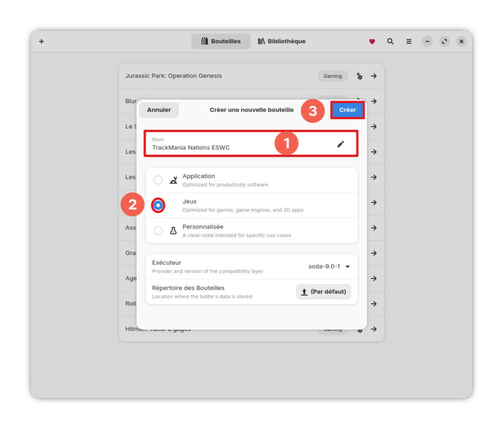 Indiquez le nom du jeux « TrackMania Nations ESWC », sélectionnez ensuite le type de programme, ici un jeu, puis cliquez sur « Créer » pour procéder à la création de la bouteille. Cela peut prendre du temps en fonction des capacités de votre ordinateur.