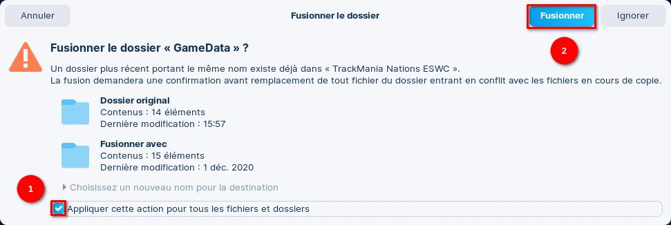 Ensuite, décompressez l’archive « compatibility.zip » et déplacez tous le contenu de l’archive extraite dans le dossier du jeu. Celui-ci vous demandera si vous souhaitez fusionner des dossiers et remplacer des fichiers. Dans les deux cas, n’oubliez pas de cocher la case « Appliquer cette action pour tous les fichiers et dossiers » et cliquez respectivement sur les boutons « Fusionner » et « Remplacer« .