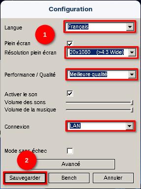 D’ici, vous pourrez mettre le jeu en français, changer la résolution du jeu, choisir les graphismes du jeu et régler la connexion internet. N’oublier pas de sauvegarder.