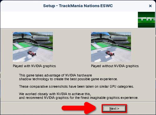 Une fois la copie du jeu terminé, le programme d’installation vous explique que le jeu fonctionnerai tellement mieux avec une carte graphique NVidia. C’était certainement vrai en 2006 mais désormais un simple iGPU Intel suffit pour obtenir un résultat identique si ce n’est meilleur. Cliquez sur « Next >«