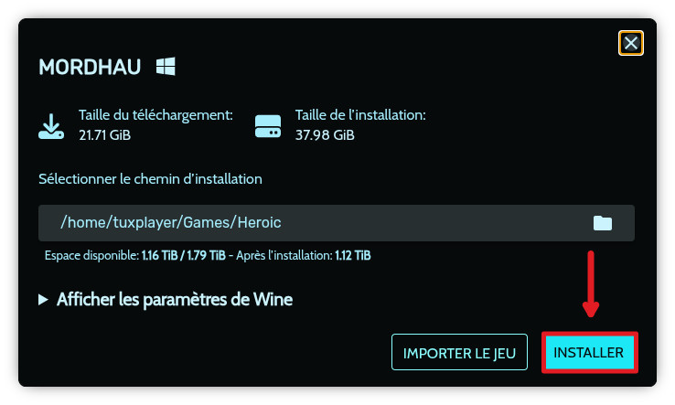 Une fenêtre s’affiche pour vous demander où et comment installer le jeu. Ne changer rien: laissez le jeu s’installer confortablement dans votre dossier Heroic habituel et laisser la version de WINE par défaut. Cliquez juste sur « Installer ».