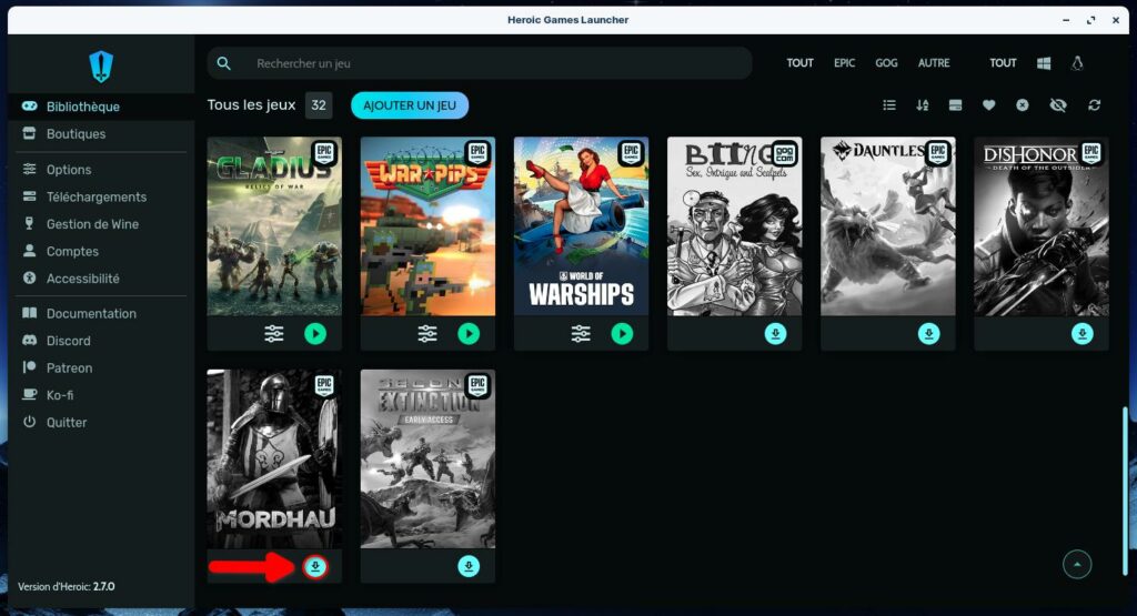 Pour commencer, démarrez l’Heroic Games Launcher. Pensez à récupérer MORDHAU tant qu’il est disponible et offert surtout via votre navigateur habituel ou en passant par Heroic.